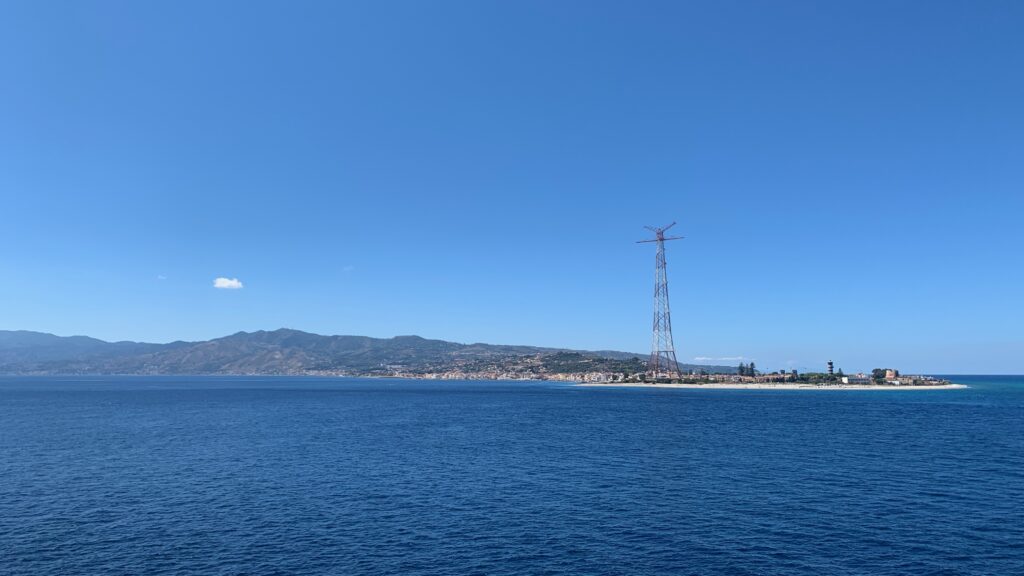 We flew from isbon to the port near Rome and got aboard a big boat. We sailed through the Strait of Messina,