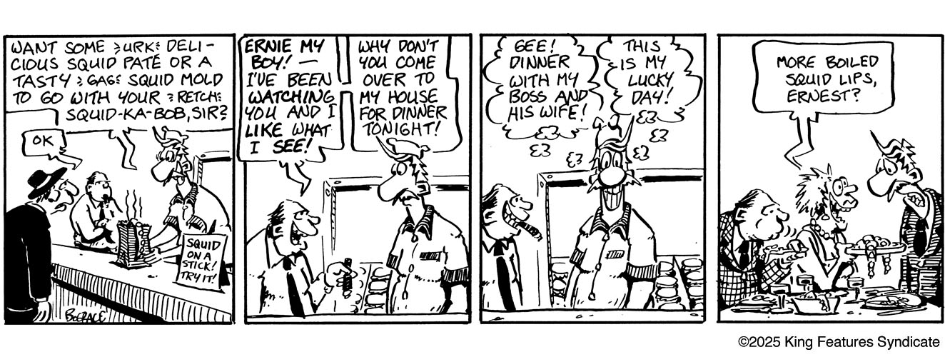 The president of King Features syndicate back the was a guy named Joe D’Angelo. He was a really nice guy, and his wife, Marcia, was a real gem. My editor was a terrifically talented young man named Jay Kennedy. Along wth me, I had put both Jay and Joe in my strip. Joe appeared as Ernie’s boss at the Squidburger restaurant, and Jay had appeared as my editor. ( Actually Jay had appeared in the middle of the story about Effie, the one that I posted over the past four weeks. It broke the continuity, so I left it out this time.) Well one day Marcia said to me “My Treasure, (She called me her “Treasure”) Joe and Jay and others have appeared in the comics, but I never have”. So I drew this little story…